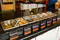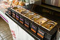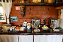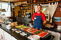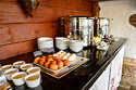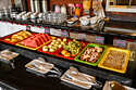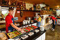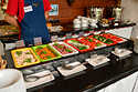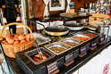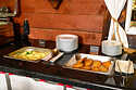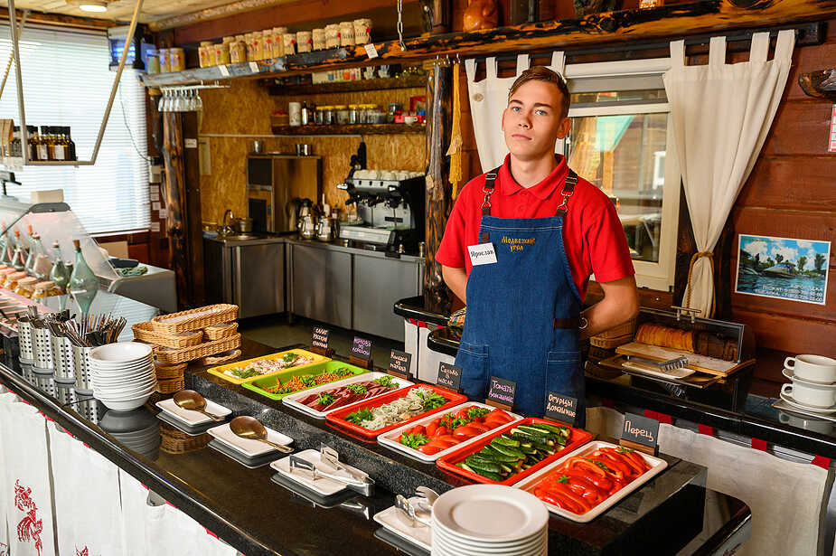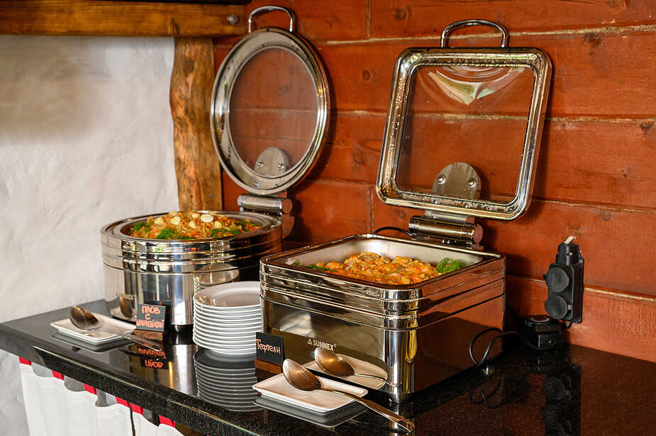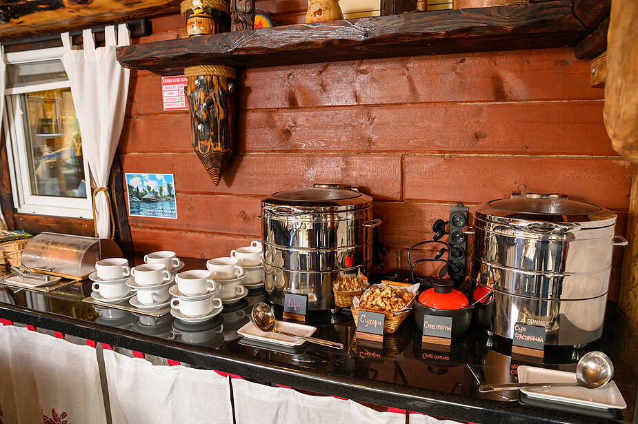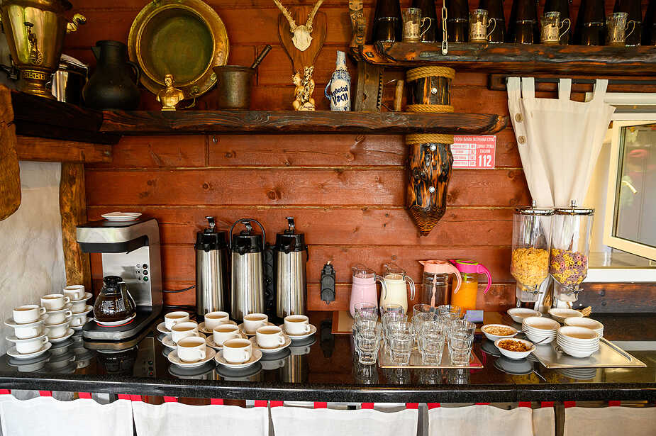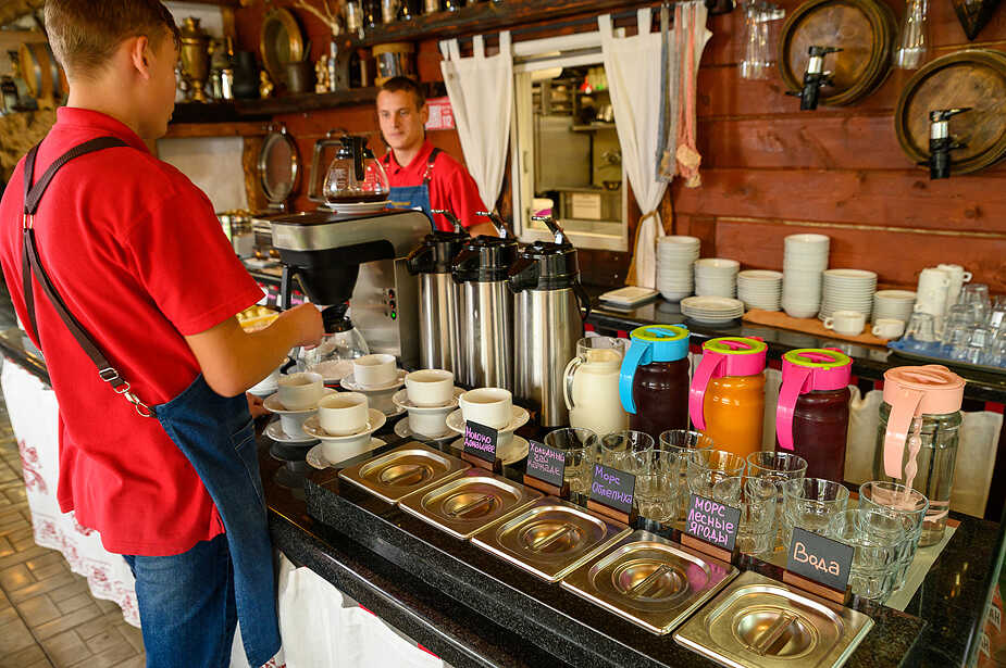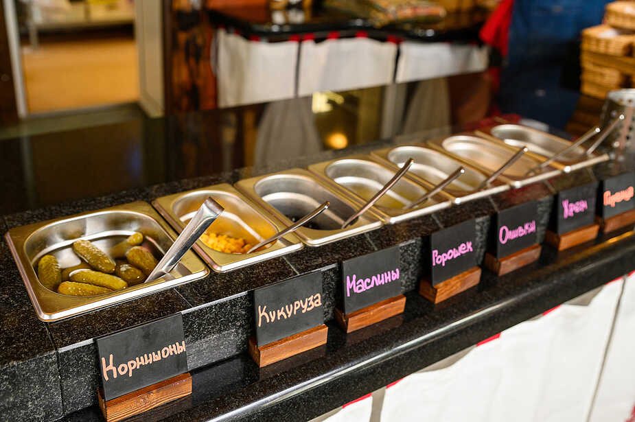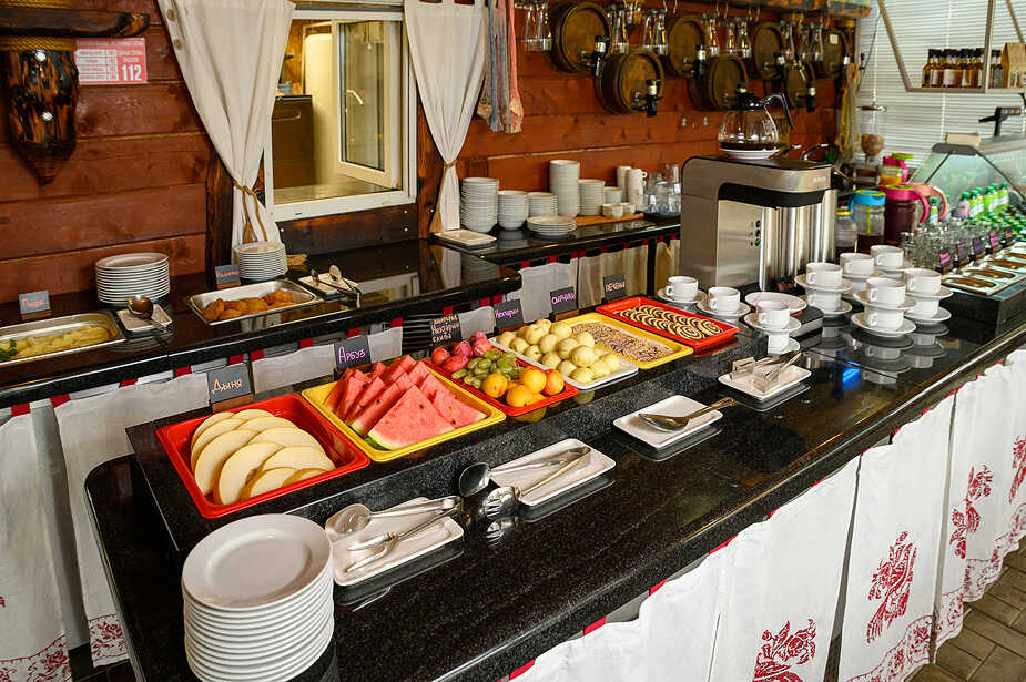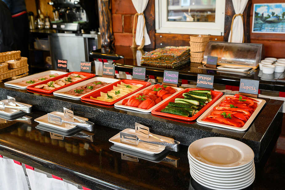 В зависимости от сезона, в летнем или зимнем зале установлены тепловые и охлаждаемые мармиты с основными блюдами, в зависимости от времени дня выставляются те или иные морсы, выпечки, молочные продукты, свежие фрукты и овощи.