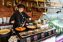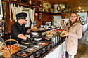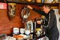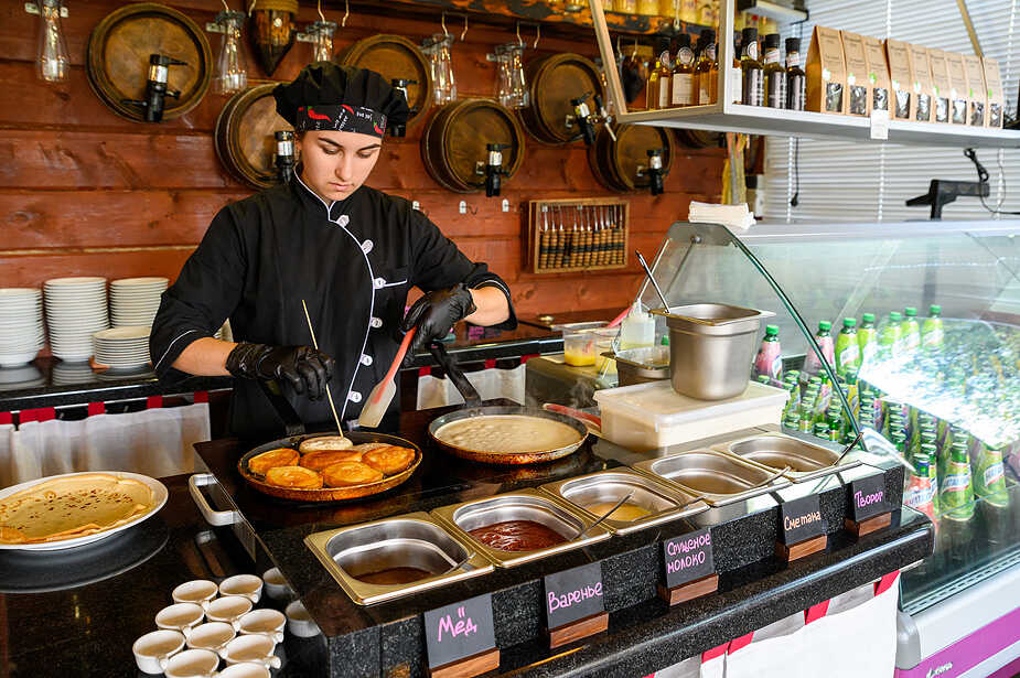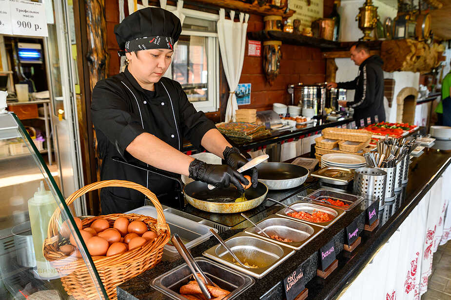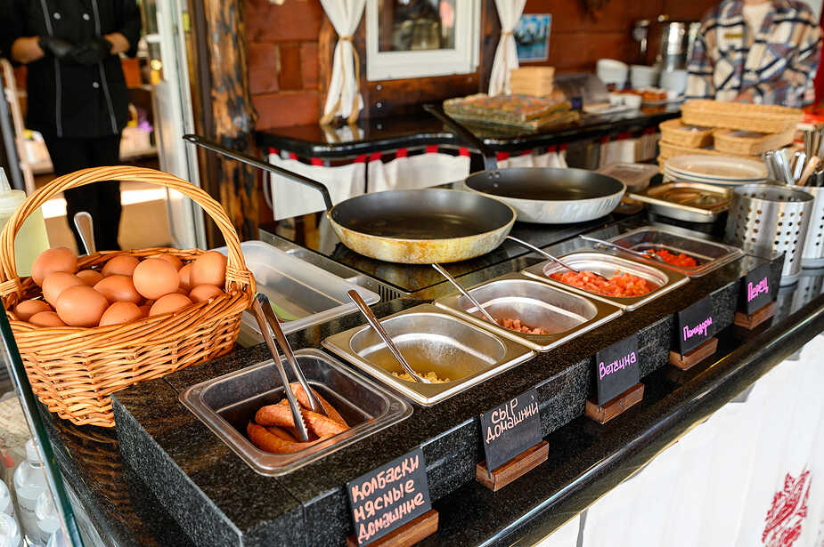 При посетителях, по их заказу, повара готовят омлеты и яичницы, блины и оладьи.
