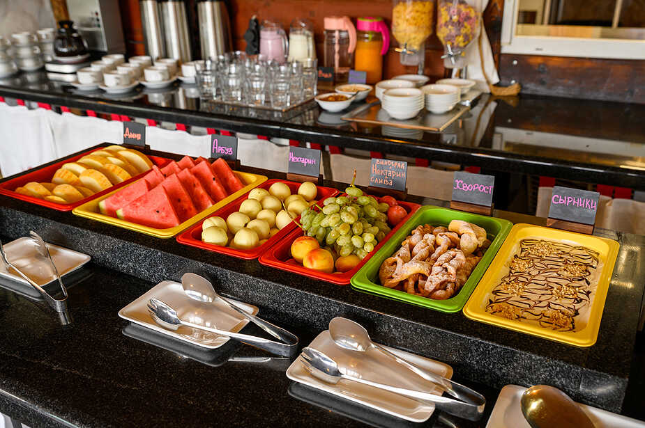• В высокий сезон шведский стол работает и на завтрак, и на ужин, стоимость питания добавляется к стоимости проживания.